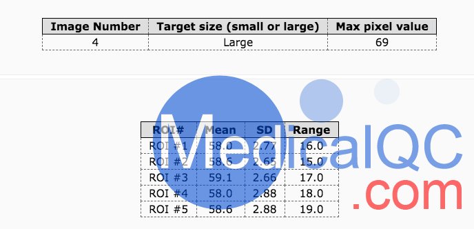 上圖顯示了 5 個感興趣區(qū)域,下圖是 Smári 報告。 除此信息外,Smári 報告還提供了一份基于 Catphan® 700 圖像測量結(jié)果的綜合報告。